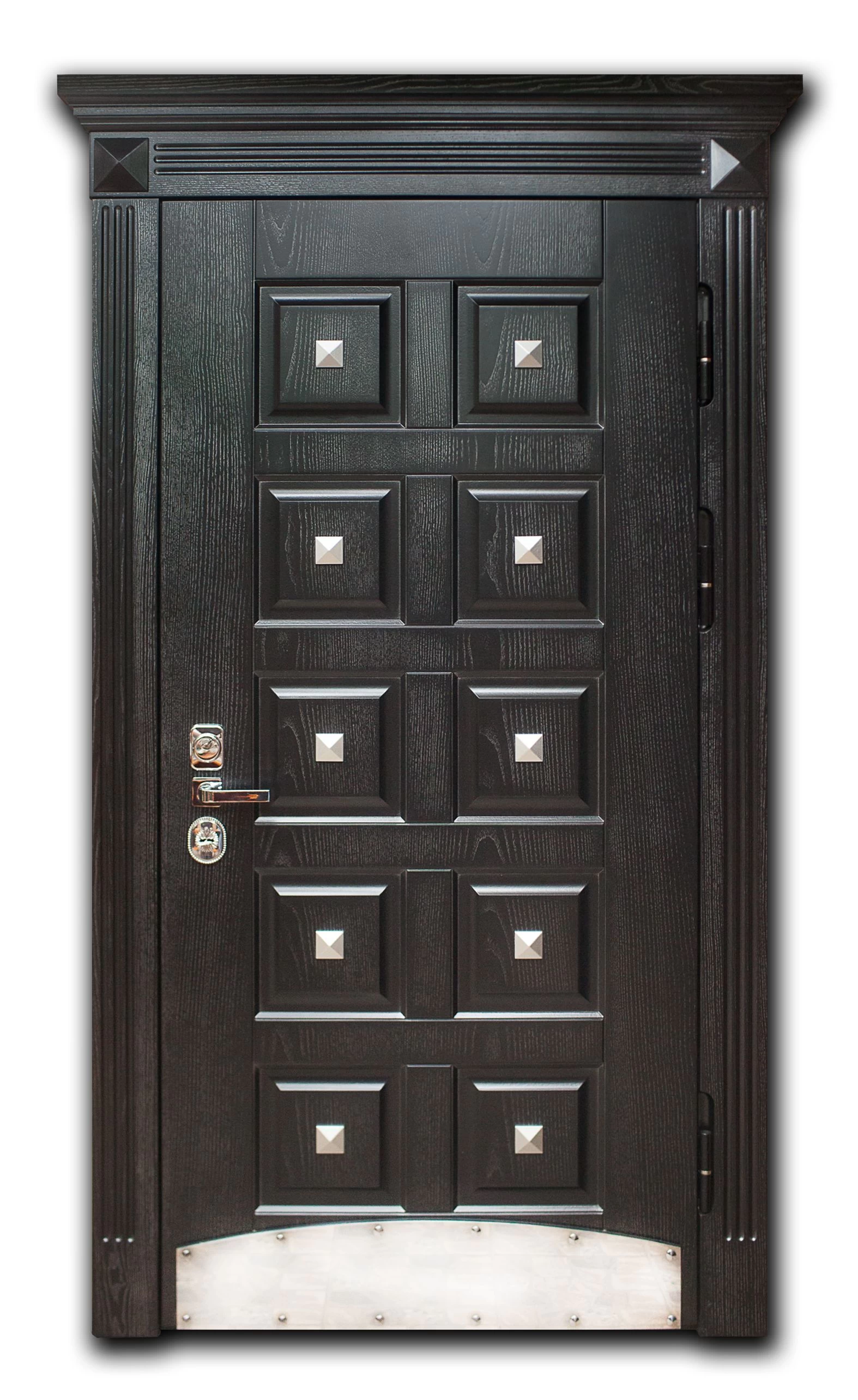 Поговорим об отделке. Вариантов декора дверей много. В большинстве случаев, для отделки элитных дверей используется массив натурального дерева или натуральный шпон с фрезеровкой. Цвет двери так же делается по желанию заказчика. Очень красиво и представительно выглядят двери с ковкой и стеклом.