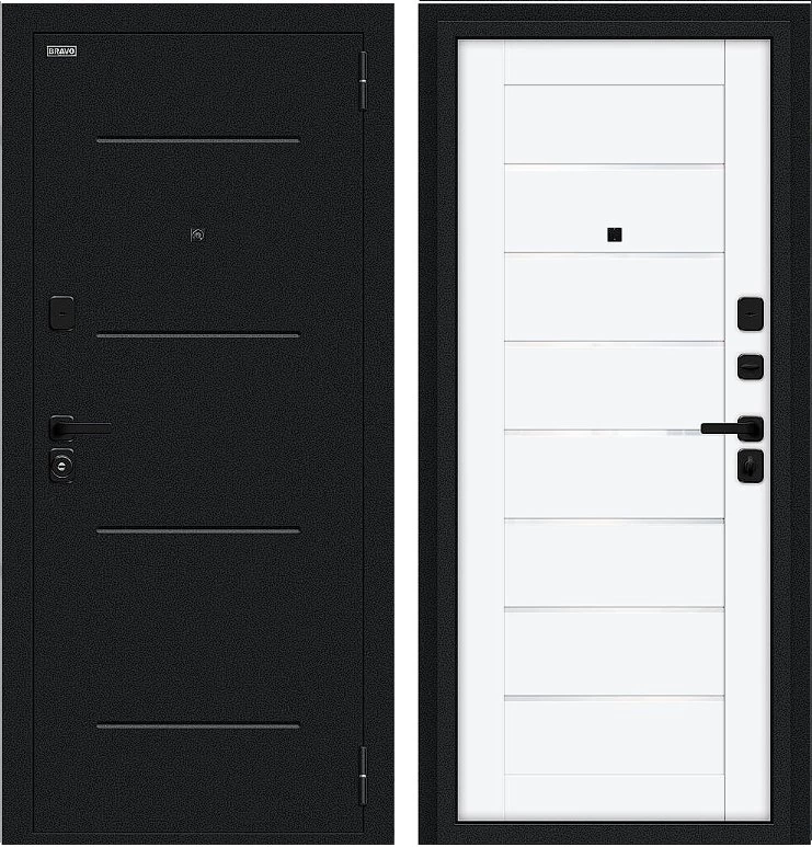 Надежная входная Дверь Браво Техно/SBlack Букле черное/White Silk премиум класса по цене 30 700 руб. Большая толщина стали защитит от проникновения в ваш дом, квартиру или коттедж. Используется очень качественная фурнитура: замки, цилиндры, ручки, защелки. Покрытие и отделка двери изготовлено под внимательным контролем производителя. Дверь имеет долгий срок службы и гарантию.